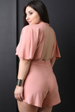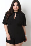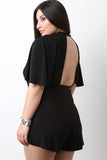 This romper features a mock neckline with double button closure at nape, keyhole cutout yoke, short butterfly sleeves, cinched high waisted seam, cutout back, and zipper closure at rear. Accessory sold separately. 95% Polyester, 5% Spandex.