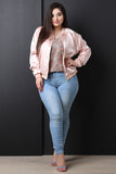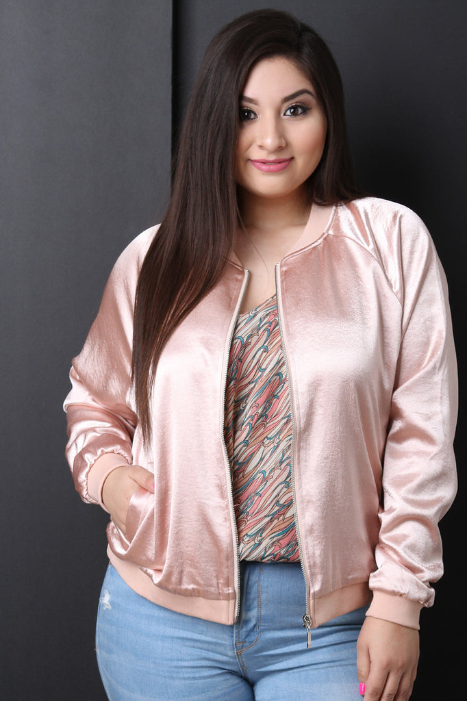 This plus size bomber jacket features a satin finished fabrication, zipper front, long sleeves, two pockets, and fully lined. Accessories sold separately. 100% Polyester.
