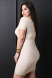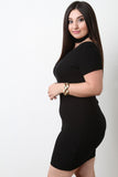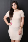 This plus size mini dress features ribbed knit fabrication, an off the shoulder neckline, choker design, short sleeves, and a back zipper closure. Accessory sold separately. 100% Acrylic.