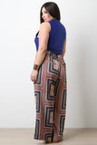 These plus size pants feature mixed prints, partial elasticized regular rise waist, two functional front pockets, two decorative back pockets, zipper fly, a single button closure and wide pant legs. Accessories sold separately. 100% Polyester.