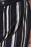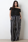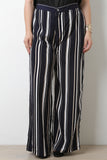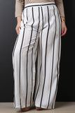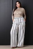 These plus size high waisted pants feature stripe prints throughout, two front pockets, back faux pockets, and wide legs. Finished with a partial elasticized waistline and zipper fly with snap button closure. Accessories sold separately. 100% Polyester.