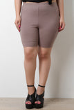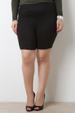 These simple plus size shorts feature a smooth knit fabrication, elastic high waisted, and a knee-length hem. Accessories sold separately. Made in U.S.A. 92% Polyester, 8% Spandex.