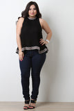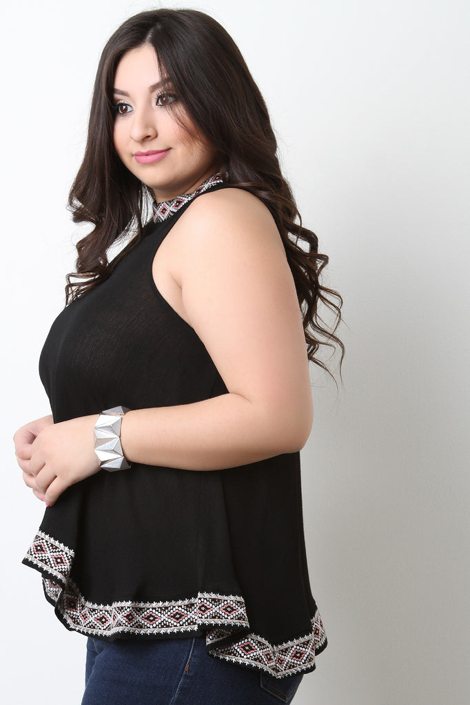 This chic plus size top features a textured knit fabrication, embroidery trimming, mock neckline, and sleeveless construction. Finished with a back keyhole cutout and a double button closure at nape. Accessories sold separately. 100% Rayon.