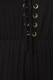 This plus size jumpsuit features a soft jersey knit fabrication, v-neckline with a corset lace-up design, sleeveless construction, elasticized waist, back keyhole with a double button closure and taper cut legs. Accessory sold separately. 97% Rayon, 3% Spandex.