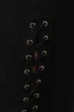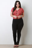These stretchy plus size pants feature an elasticized high rise construction, taper cut legs with eyelets with corset lace-up detailing in the front and jersey knit fabrication. Accessories sold separately. 95% Cotton, 5% Spandex.