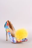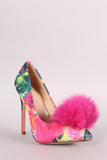 This lovely pointy toe silhouette with an eye-catching faux fur pom pom detail, single sole, and wrapped stiletto heel. Finished with lightly padded insole and easy slide style.