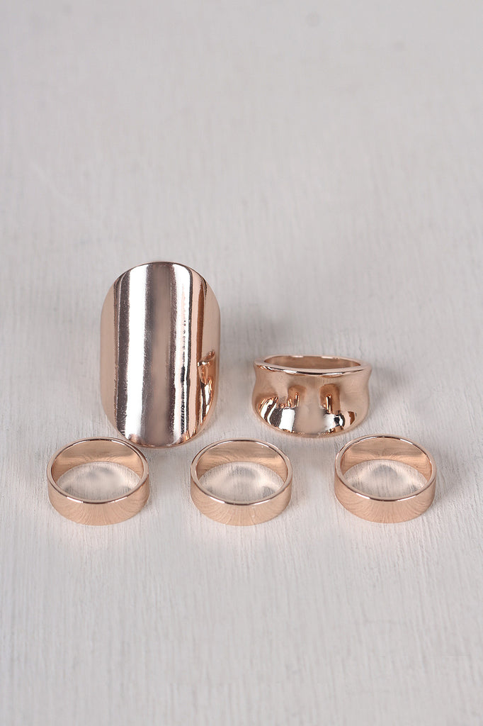 This ring set features 5 polished rings, three simple midi bands and two larger armor style rings, Non adjustable bands.
