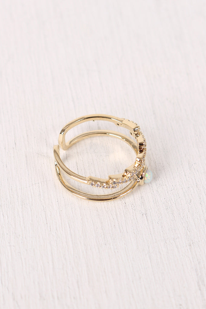 This open ended ring features a high polished metal finish, faux gemstone and rhinestones accent lightening bolt bands, open row design.