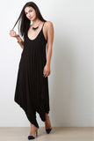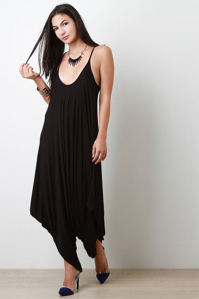 This oversize jersey jumpsuit features a plunging round neckline at the front and back, thin shoulder straps, and voluminous draping asymmetrical bottom. Accessories sold separately. Made in U.S.A. 94% Rayon, 6% Spandex.