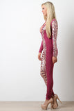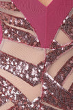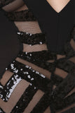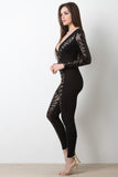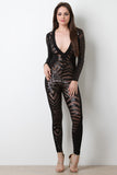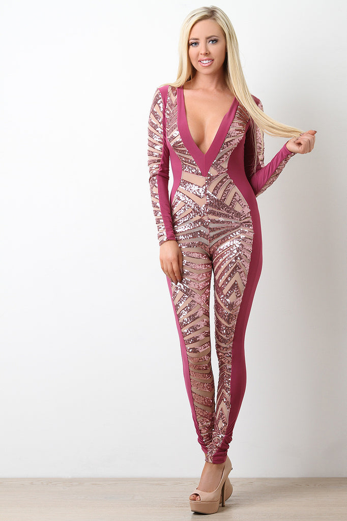 This jumpsuit features stretchy fabrication, chevron sequins design, plunging v-neckline, long sleeves, and high waist taper cut legs. Accessories sold separately. Made in U.S.A. 100% Polyester.