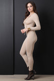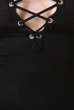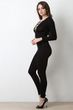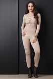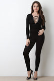 This sexy jumpsuit features a jersey knit fabrication, v-neckline with grommets with corseting lace-up detail at front, long sleeves, and a sculpture fit. Accessory sold separately. Made in U.S.A. 95% Rayon, 5% Spandex.