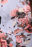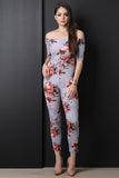 This jumpsuit features a stretchy textured knit with floral prints throughout, off-the-shoulder neckline, and elbow sleeves. Finished with a taper cut legs and back zip-up closure. Accessories sold separately. Made in U.S.A. 96% Polyester, 4% Spandex.