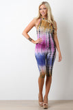 This romper features a jersey knit fabrication with tie dye print, sleeveless construction, mock neckline with double button closure at nape, and an open back design. Finished with a capri-length hemline and a stretchy silhouette. Accessories sold separately. Made in U.S.A. 96% Rayon, 4% Spandex.