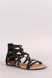 This flat sandal features an open toe silhouette, studs accent, strappy construction with o-ring embellishment, lightly padded insole, and rear zipper closure for easy on/off.
