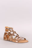 This flat sandal features an open toe silhouette, studs accents, strappy construction with o-ring embellishment, lightly padded insole, and rear zipper closure for easy on/off.