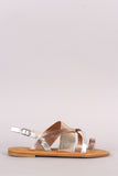 This charming flat sandal features a toe loop strap, strappy tri-tone metallic design upper, lightly padded insole, and adjustable slingback strap with buckle fastening.