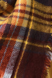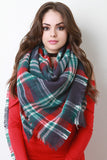 This blanket scarf features a woven fabrication, frayed fringe edges, and plaid pattern. Can be worn as a shawl or over-sized scarf. 100% Acrylic.