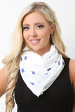 This lightweight scarf features a whale design with polka dots and embroidered trimming. 50% Cotton, 50% Polyester.