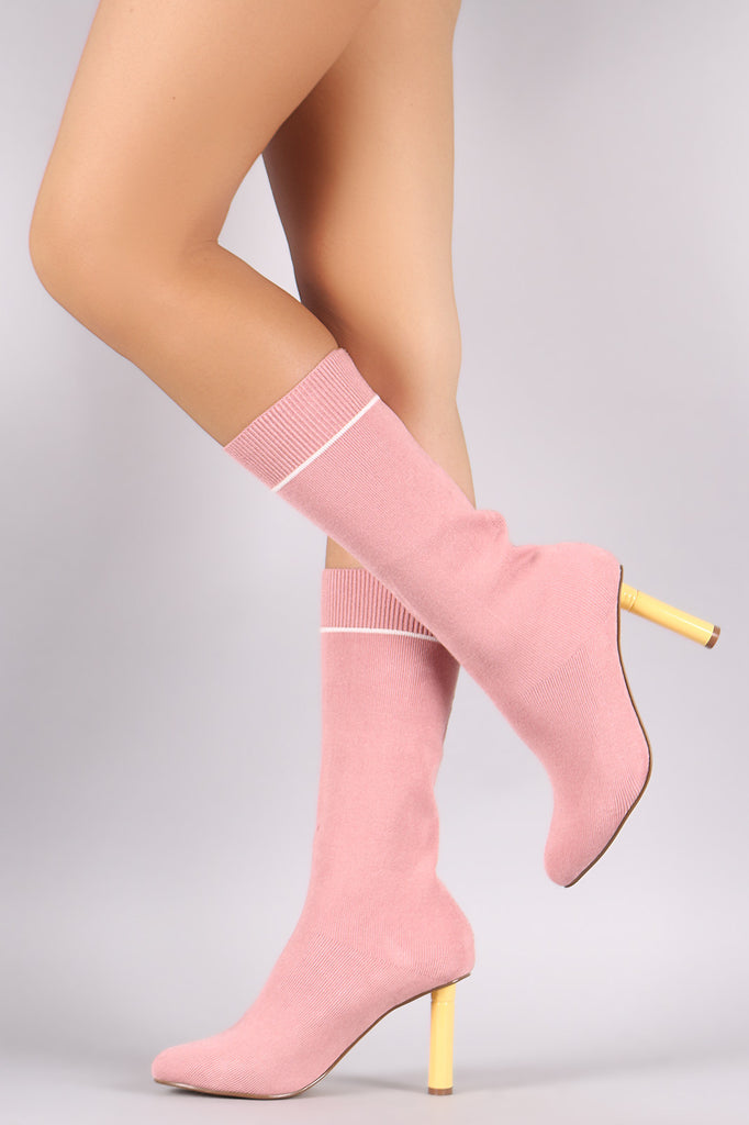 These cozy boots feature a stretchy ribbed knit fabrication with stripe detail, almond toe silhouette, and contrast oval heel. Finished with a cushioned insole and pull-on construction.