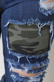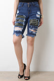 These dark wash denim shorts features a knee length fringe hem, distress holes, camouflage patch construction, four pockets, belt loops, zipper fly, and a single button. Accessory sold separately. Made in U.S.A. 68% Cotton, 2% Modal, 7% T400, 1% Spandex. Contrast: 90% Cotton, 10% Spandex.