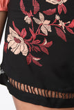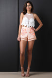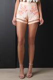 These shorts features a high waisted design, hidden side zipper, caged constructed hem, and floral print at front. Accessory sold separately. 100% Rayon.
