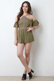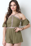 This romper features a cutaway neckline, adjustable shoulder straps, short flutter sleeves, threaded braided lace trimming accent, zipper back, and partially lined. Accessories sold separately. 100% Rayon.
