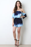 This bardot romper features tie-dye design, elastic off-the-shoulder neckline, flutter tier, short bell sleeves, elastic cinched waist, shorts bottom, side pockets, and partially lined. Accessories sold separately. 100% Rayon.