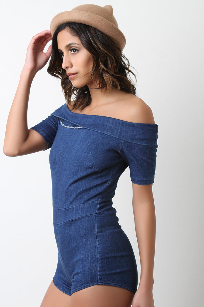 This denim romper features a fold over off the shoulder neckline, short sleeves construction, fitted silhouette, and rear zipper closure. Accessories sold separately. Made in U.S.A. 81% Cotton, 15% Polyester, 4% Spandex.