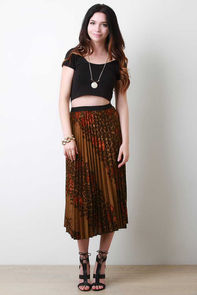 This midi A-line skirt features a diagonal floral leopard print design, accordion pleat, and an elasticized waistband. Accessory sold separately. Made in U.S.A. 90% Polyester, 10% Spandex.