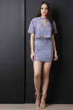 This high waisted skirt features a wide elasticized waist, distressed shredded details, and a mini length. Accessory sold separately. Made in U.S.A. 42% Polyester, 35% Cotton, 20% Rayon, 3% Spandex.