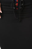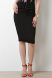 This midi skirt features a high waisted design, corset lace-up front, and stretchy sculpture fit. Accessory sold separately.