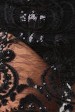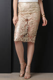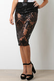 This midi skirt features semi-sheer lace, baroque stitching with sequin accents, hidden back zipper closure, and brief lining. Accessories sold separately. Self: 100% Polyester. Contrast: 95% Rayon, 5% Spandex.