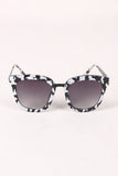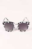These ultra-chic sunglasses feature a plastic marble frame with slight cats eye design, tinted lenses, metal arms, and single bridge with nose cushions.