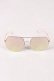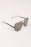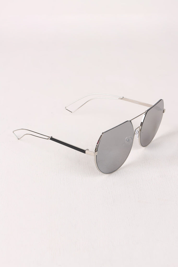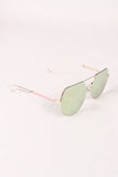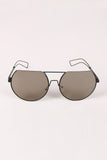 These sunglasses feature a partial metal trim frames with rounded laser-cut lenses, double bridge design, open metal accent arms, and clear nose cushions.