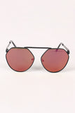 This charming sunglasses features a geometric-shape metallic frame with mirrored lenses, single bridge, metal arms, and clear nose cushions.
