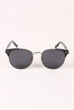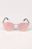 These clubmaster-style sunglasses feature a round mirrored lenses with slight cat eye detail, metallic frame, plastic arms, and clear nose pads.