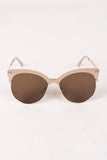 These clubmaster-style sunglasses feature a round tinted lenses with plastic brow detail, metallic bottom frame, flat metal arms, and nose bridge cushions.