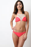 This two piece bikini swimsuit features a contrasting crochet yoke, self-tie halter neck and back, finished with removable padded cups. Bikini bottom features a low rise waist, 3-straps design at sides, and fully lined. Accessories sold separately. 80% Nylon, 20% Spandex. Lining: 100% Polyester.