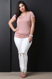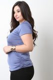 This trendy plus size top features smooth satin fabrication, round neckline with a strappy cage design, short sleeve construction, and cinched sides. Accessories sold separately. Made in U.S.A. 94% Polyester, 6% Spandex.