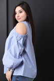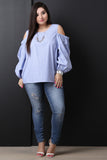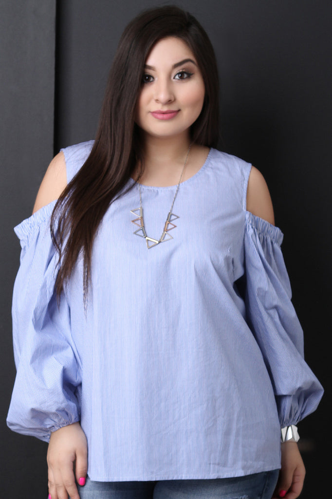 This plus size top features a round neckline, elasticized cold shoulder design, long bishop sleeves with elasticized cuffs, and contrasting vertical stripes. Finished with a back keyhole cutout with a single button closure at nape. Accessories sold separately. 100% Cottom.