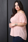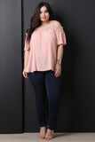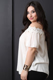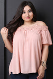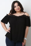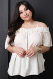 This cute plus size top features a floral crochet knit trim, spaghetti shoulder straps with a cold shoulder design, elbow length sleeves, and boxy silhouette. Accessories sold separately. 100% Rayon.