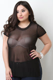 This plus size top features semi-sheer mesh fabrication, a round neckline, short sleeves, and a high-low hem. Accessory sold separately. 90% Nylon, 10% Spandex.
