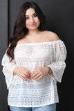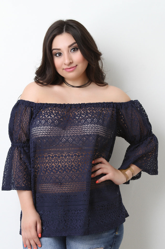 This boho plus size top features a crochet knit, an elasticized off-the-shoulder neckline, three-quarter length bell sleeves, and a boxy cut fit. Accessory sold separately. Made in U.S.A. 70% Cotton, 30% Nylon.