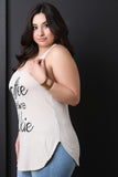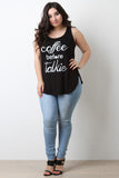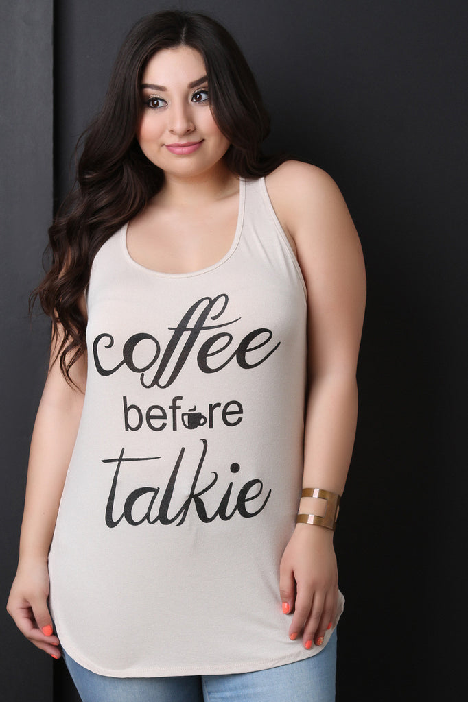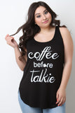 This cute plus size tank top features a jersey knit fabric, scoop neckline, "Coffee before talkie" print at front, sleeveless construction, an elasticized racerback, and a rounded hemline. Accessories sold separately. 97% Viscose, 3% Spandex.