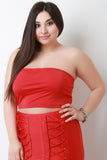 This plus size tube top features a strechy fabrication, tube neckline, sleeveless construction, corset lace-up detail at back, and a cropped hemline. Accessories sold separately. 89% Polyester, 11% Spandex.