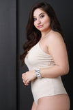 This plus size bodysuit features a stretchy knit, v-neckline with a strap accent, sleeveless construction, adjustable spaghetti shoulder straps, and snap button closures at brief bottom. Accessory sold separately. 65% Nylon, 35% Rayon.