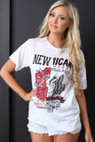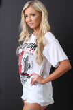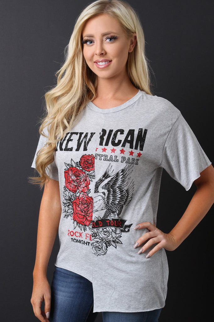 This casual top features lightweight jersey knit, round neck, rock graphic print, short sleeves, and asymmetrical hem. Accessories sold separately. 47% Cotton, 53% Modal.