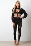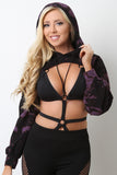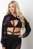 This crop top features a bleached design, hooded neckline with drawstring, large cutout design at front, long cuffed sleeves, and a cropped hemline. Accessories sold separately. Made in U.S.A. 94% Cotton, 6% Spandex.