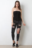 This fitted tube top features a stretchy fabrication, corset lace-up front, cinched sides with self-tie detailing, and an exposed back zipper closure. Accessories sold seperately. Made in U.S.A. 95% Rayon, 5% Spandex.