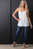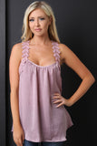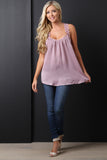 This top features a scooped neckline, sleeveless construction, crochet detail lace strap, flowy satin fabrication, and a racer back with crochet detailing. Accessories sold separately. Made in U.S.A. 100% Polyester.